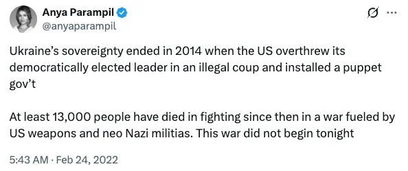 I must admit, like many others (though notably not the White House), I did not believe that there would be an invasion of Ukraine – and certainly not in the flagrant barbarism of a full-on military takeover; I was convinced it would be an army-backed coup and nothing more. But as soon as the first simmering of a possible invasion started, I did know what I expected to infect social media. Russia – especially under the Putinist junta – has long been given controversial appraisal by many so-proclaimed “dissident” political commentators in the West, so I knew I was in for aggravation. And it’s become apparent that most of the pro-Kremlin apologist rot was already waiting for a chance to splurge across the Internet. On a personal level, it’s been revealing to see so many that I regarded as allies during the democratic-populist revolutions of the late 2010s, descend into gibbering hysteria over the alleged West provocation of this war; to watch Maajid Nawaz’s fall into hysterical paranoia over both the COVID-19 mandates and this war has been especially harrowing.
